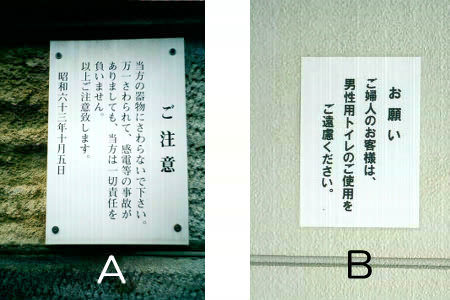 B こういうのって、「通り抜け禁止」と同じで、男性トイレを利用しているおばさんがいると宣言しているようなもんですね。(笑)