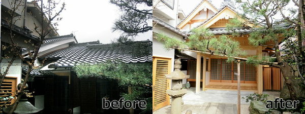 本堂への入口は元は平入りの形になっていました。それを今回周辺の水廻りや座敷の改修に伴い屋根の方向を90度を変え、妻入りの形にしました。これにより正面玄関入口は堂々たる構えになり、破風や懸魚、鬼瓦などが美しく見えるようになりました。奥の大屋根の棟の鬼も新しくしました。